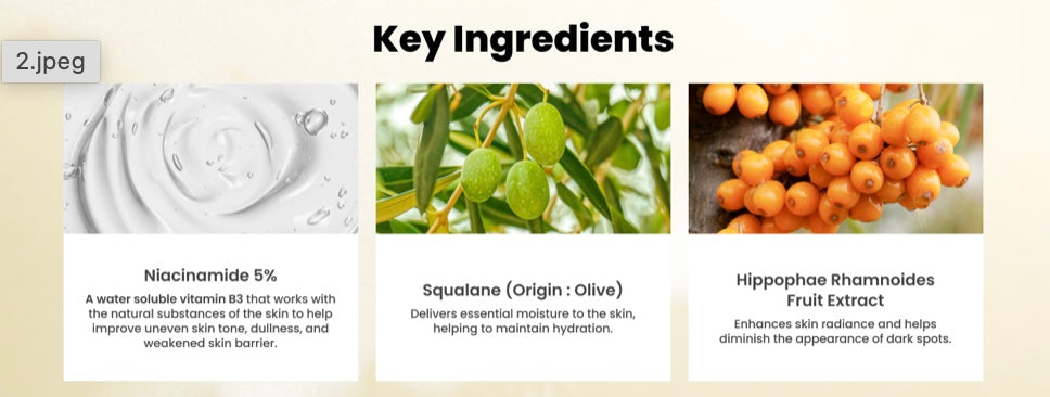 Water, Glycerin, Niacinamide, Sodium Hyaluronate, Propanediol, Erythritol, Butylene Glycol, Squalane, Oryza Sativa (Rice) Bran Extract, Calendula Officinalis Flower Extract, Carica Papaya (Papaya) Fruit Extract, Hippophae Rhamnoides Fruit Extract, Malpighia Emarginata(Acerola)Fruit Extract, Polyglyceryl-10 Laurate, Chlorphenesin, Arginine, Ethylhexylglycerin, Carbomer, Glutathione, 1,2-Hexanediol, Hydroxypropyl Cyclodextrin, Disodium EDTA, Hydroxyethylcellulose, Allantoin, Rosmarinus Officinalis (Rosemary) Leaf Oil