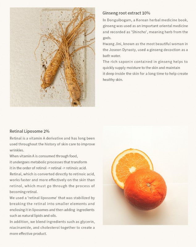 Water, panax ginseng root extract, glycerin, dipropylene glycol, caprylic/caprictriglyceride, 1,2-hexanediol, pentaerythrityl tetraethylhexanoate, niacinamide, butyleneglycol dicaprylate/dicaprate, cetearyl alcohol, sorbitan olivate, cetearyl olivate,butylene glycol, hydrogenated lecithin, tromethamine, carbomer, glyceryl stearate,macadamia ternifolia seed oil, adenosine, theobroma cacao (cocoa) extract, dextrin,cholesterol, polyglyceryl-10 oleate, retinal, brassica campestris (rapeseed) sterols,phytosteryl/behenyl/octyldodecyl lauroyl glutamate, silica, sodium hyaluronate,tocopherol, aluminum/magnesium hydroxide stearate, potassium cetyl phosphate,pentaerythrityl tetra-di-t-butyl hydroxyhydrocinnamate, ceramide np, palmitoyltripeptide-5, disodium edta, ethylhexylglycerin