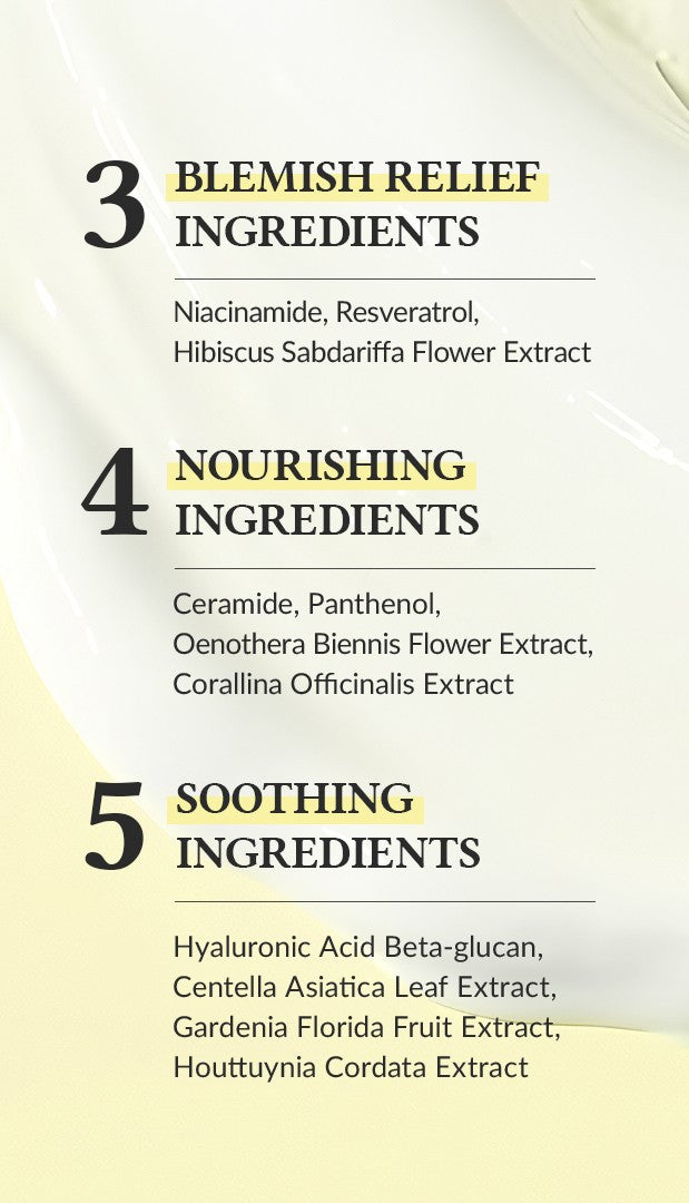 Water, Propanediol, Glycerin, Cyclohexasiloxane, 1,2-hexanediol, Niacinamide, Caprylic/capric, Triglyceride, Polyglycerin-3, Panthenol, Polyglyceryl-10 Stearate, Hydrogenated Polydecene, Hydrogenated Poly, Dicaprylyl Carbonate, Ammonium Acryloyldimethyltaurate/vp Copolymer, C14-22 Alcohols, Polymethylsilsesquioxane, C12-20 Alkyl Glucoside, Butylene Glycol, Acrylates/c10-30 Alkyl Acrylate Crosspolymer, Ethylhexylglycerin, Polyquaternium-51, Tromethamine, Sodium Hyaluronate, Coptis Japonica Root Extract, Houttuynia Cordata Extract, Oenothera Biennis Flower Extract, Beta-glucan, Resveratrol, Gardenia Florida Fruit Extract, Lavandula Angustifolia Flower Extract, Opuntia Ficus-indica Stem Extract, Hydrolyzed Hyaluronic Acid, Centella Asiatica Leaf Extract, Phenoxyethanol, Hibiscus Sabdariffa Flower Extract, Tocopherol, Corallina Officinalis Extract, Ceramide Np