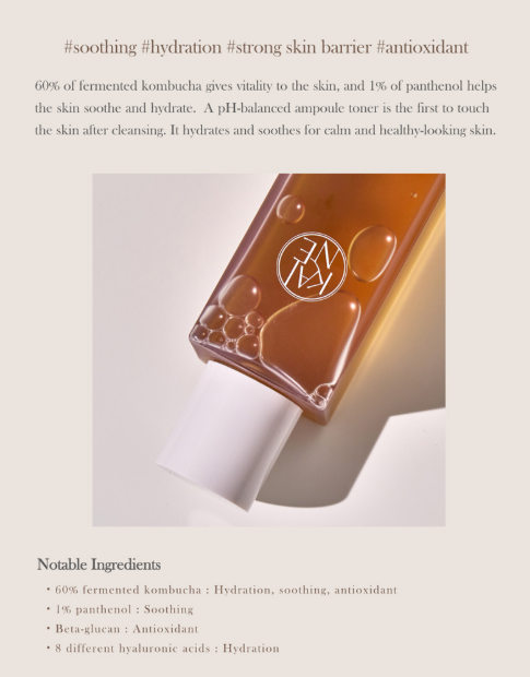 Experience the power of hydration and skin resilience with the Kaine Kombu Balancing Ampoule Toner. Infused with 60% fermented kombucha and 8 types of hyaluronic acid, this vegan, pH-balanced formula deeply nourishes while reinforcing your skin’s natural barrier.